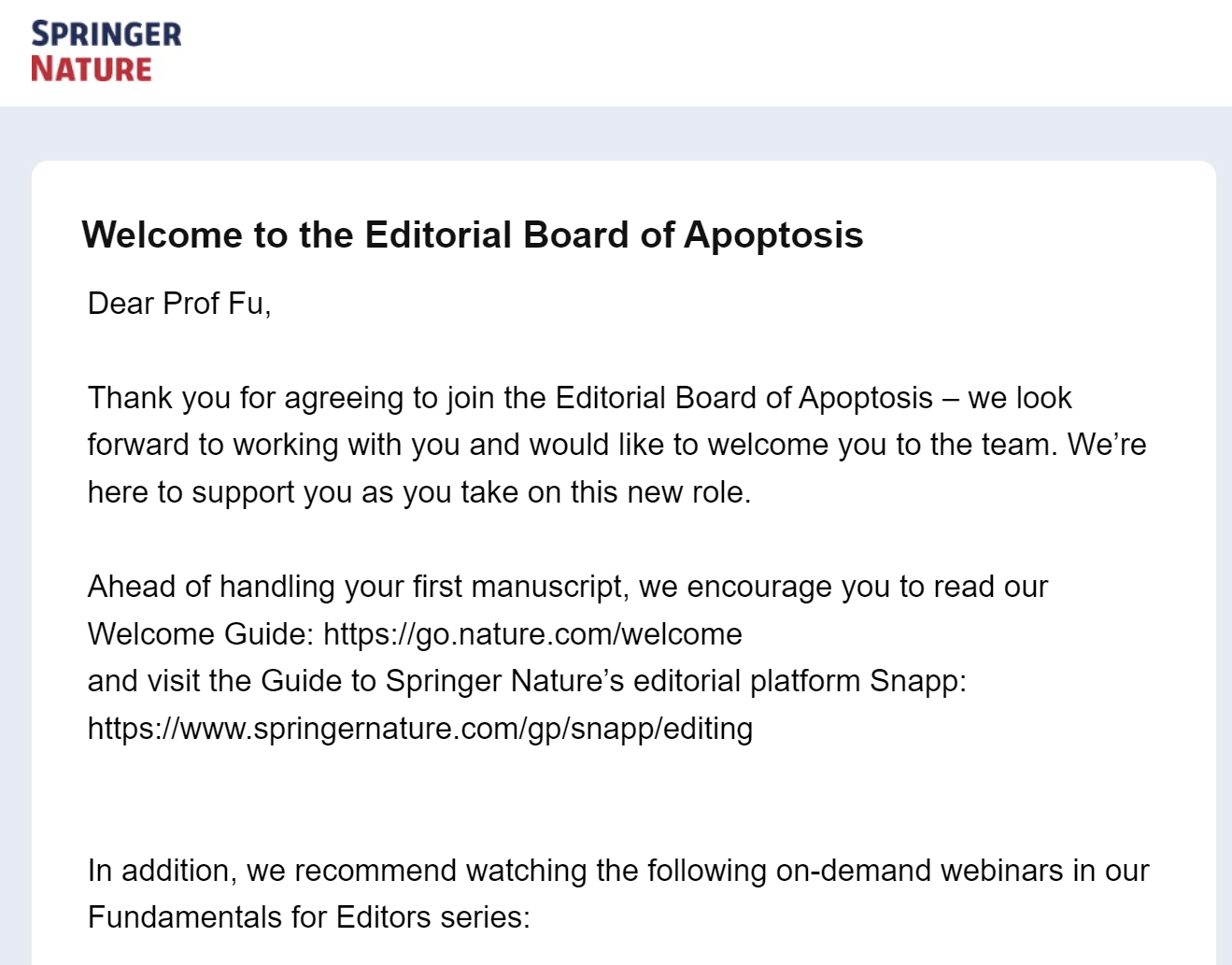 近日,91视频 符雷蕾副教授收到国际程序性细胞死亡权威期刊Apoptosis的正式邀请,已成为该期刊的副主编(Associate Editor)。Apoptosis创刊于1996年,2023年影响因子为6.1,JCR一区/中科院二区。