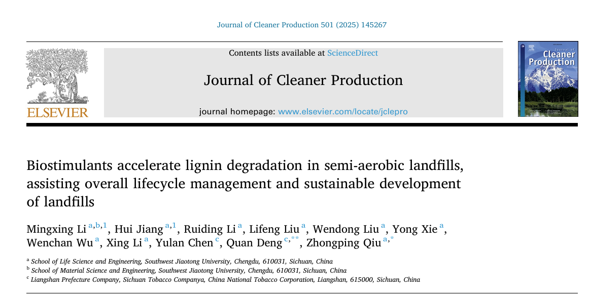 邱忠平教授团队的研究成果“Biostimulants accelerate lignin degradation in semi-aerobic landfills, assisting overall lifecycle management and sustainable development of landfills”,2021级博士研究生李明星与2022级硕士研究生江慧为共同第一作者,通讯作者为邱忠平教授,91视频