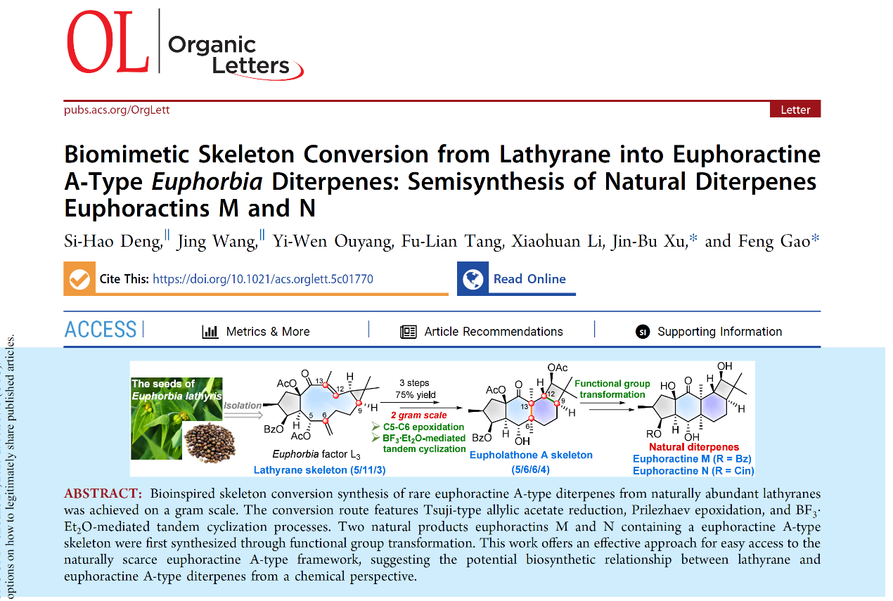 高峰教授团队的最新研究成果“Biomimetic Skeleton Conversion from Lathyrane into Euphoractine A‑Type Euphorbia Diterpenes: Semisynthesis of Natural Diterpenes Euphoractins M and N”。硕士研究生邓思浩和王婧为第一作者,硕士研究生欧阳艺文和唐博莲,以及李晓欢副教授参与该项工作,高峰教授和徐巾卜助理教授为通讯作者,91视频