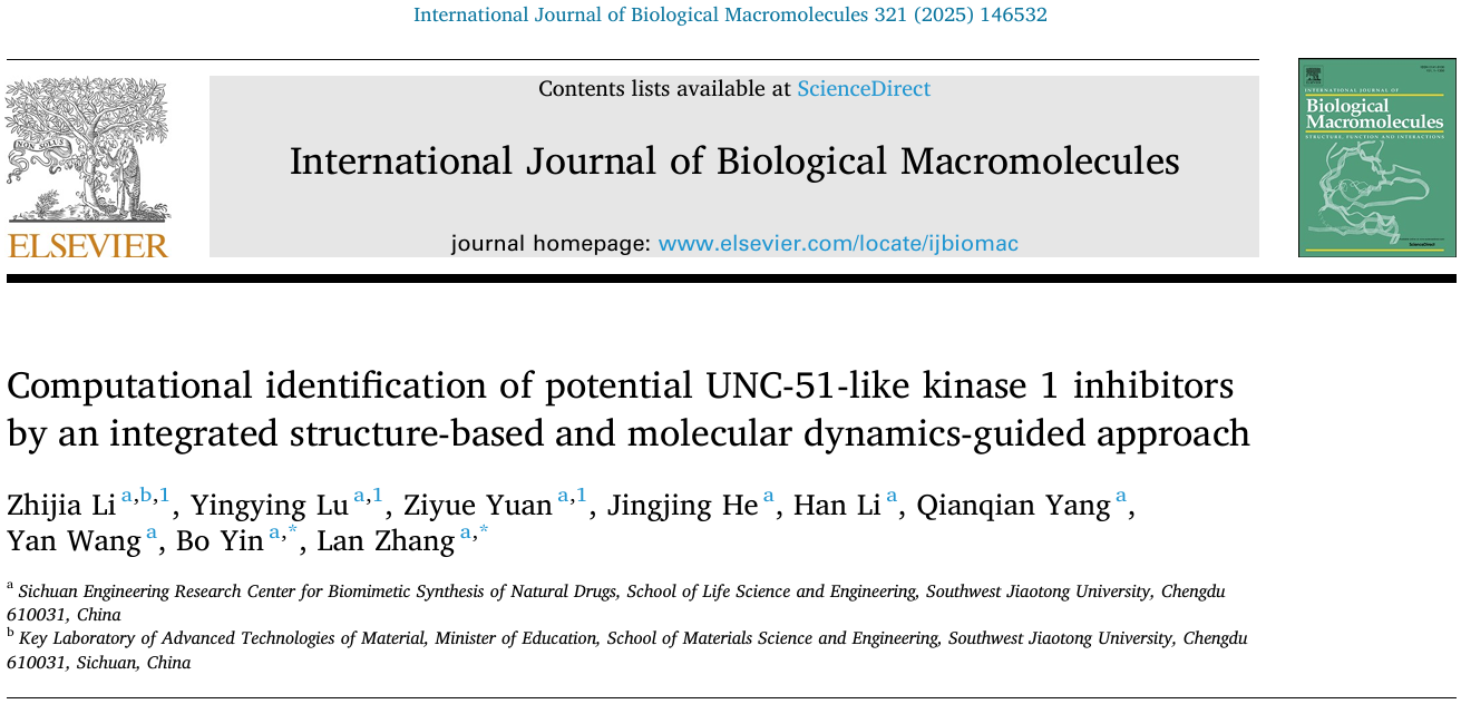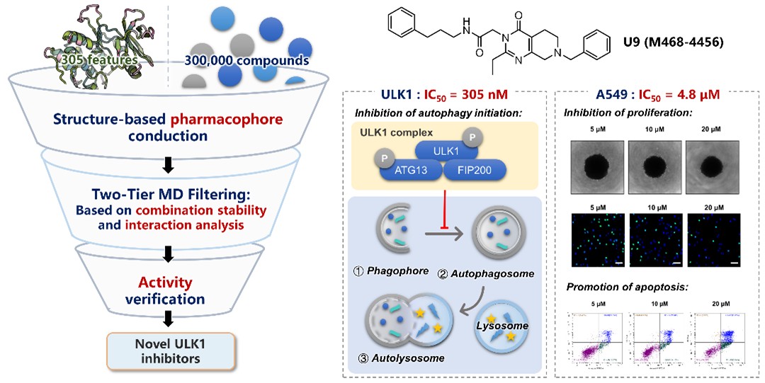 其中,题为《Computational identification of potential UNC-51-like kinase 1 inhibitors by an integrated structure-based and molecular dynamics-guided approach》的研究性论文提出一套整合结构生物学与分子动力学的计算框架,通过多尺度模拟与实验验证,发现新型ULK1抑制剂U9(IC50 = 305 nM)。