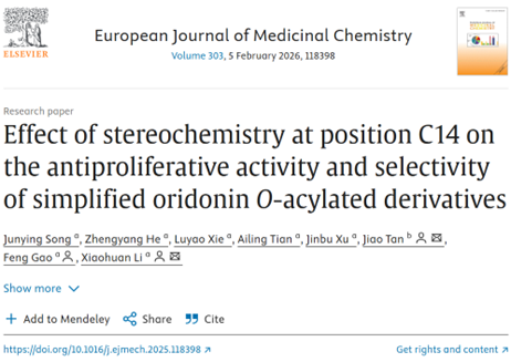 天然产物成药性研究团队完成的最新研究成果,论文题为“Effect of stereochemistry at position C14 on the antiproliferative activity and selectivity of simplified oridonin O‑acylated derivatives”。2022级硕士研究生宋俊英为第一作者,谭娇、高峰教授和李晓欢副教授为共同通讯作者,91视频