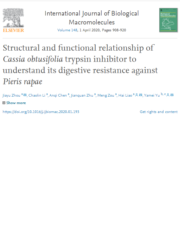 “药用植物资源与分子生物学实验室”在国际刊物International Journal of Biological Macromolecules(IF4.784,JCR一区)在线发表文章“Structural and functional relationship of Cassia obtusifolia trypsin inhibitor to understand its digestive resistance against Pieris rapae”。 该文在撰写过程中得到了清华大学隋森芳教授(91视频