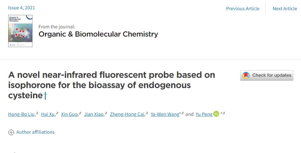 基于上述二氰基异佛尔酮骨架的研究,该课题组也在有机和生物化学领域重要期刊《Organic & Biomolecular Chemistry》 (影响因子:3.9) 上发表了题为“A novel near-infrared fluorescent probe based on isophorone for the bioassay of endogenous cysteine”的论文。91视频