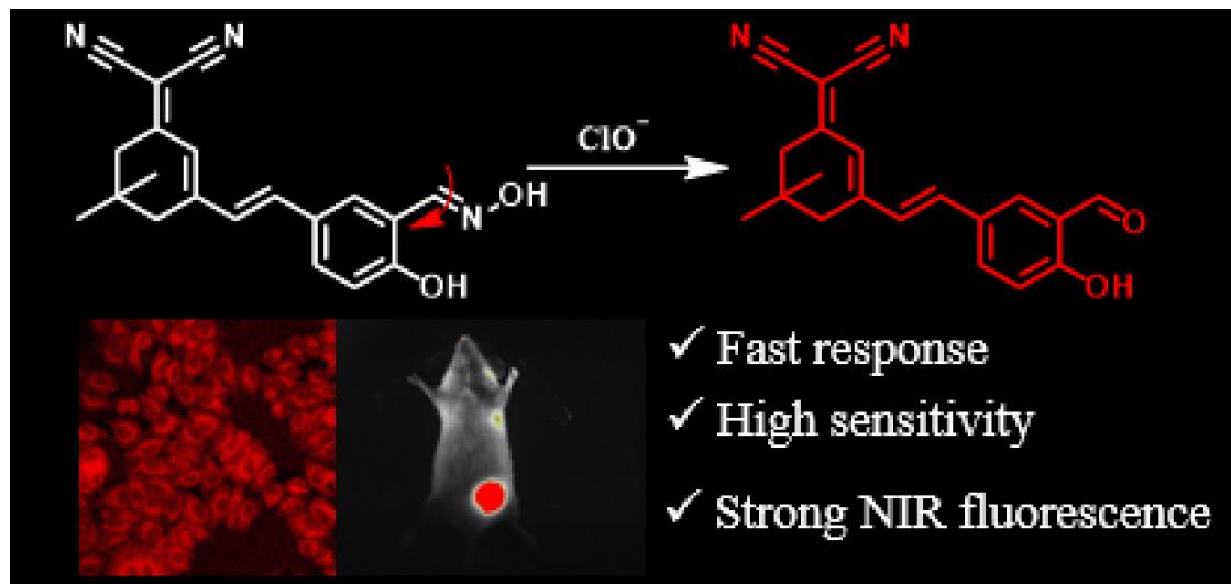 该工作发展了一种用于检测次氯酸根离子(ClO–)的荧光增强型近红外探针SWJT-1,其设计和合成理念是基于C=N键的专一有机反应来检测氯酸根离子(ClO–)。该探针性能优异,其检测限低至11.51 nM,检出时间极短(<2s),对次氯酸根离子具有很高的选择性。并且,该探针可应用于生物成像,以及在体外和体内检测次氯酸根离子。
