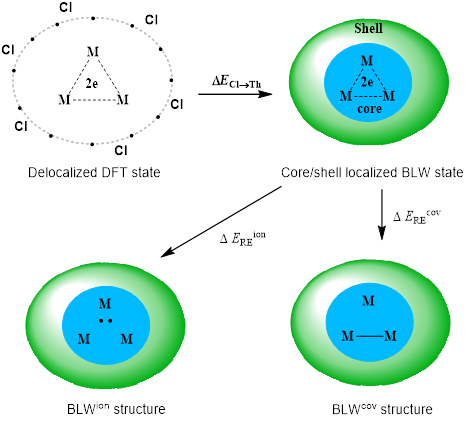 在厘清了Th3Cl6笼状中心化学键的形成机理后,研究者进而探讨了人们更为关注的问题,即Th3 金属簇是否存在σ-芳香性?芳香性一般与稳定性相关,因此必须计算电子离域导致的能量变化为实现这一目的,研究者构造了核/壳电子定域态(BLW)以及Th3金属键的共价结构(BLWcov),如图4所示。据此,研究者成功分离并定量计算了电荷转移键 (ThCl2)3中的离域能ΔECl→ThTh3键中的共振能ΔEREcov。通过与经典σ-芳香体系H3+和非σ-芳香体系Li3+,研究者发现Th3金属键确是离域(ΔEREcov约为 40kcal/mol)且存在σ-芳香性 ,其芳香性强度约是H3+60%