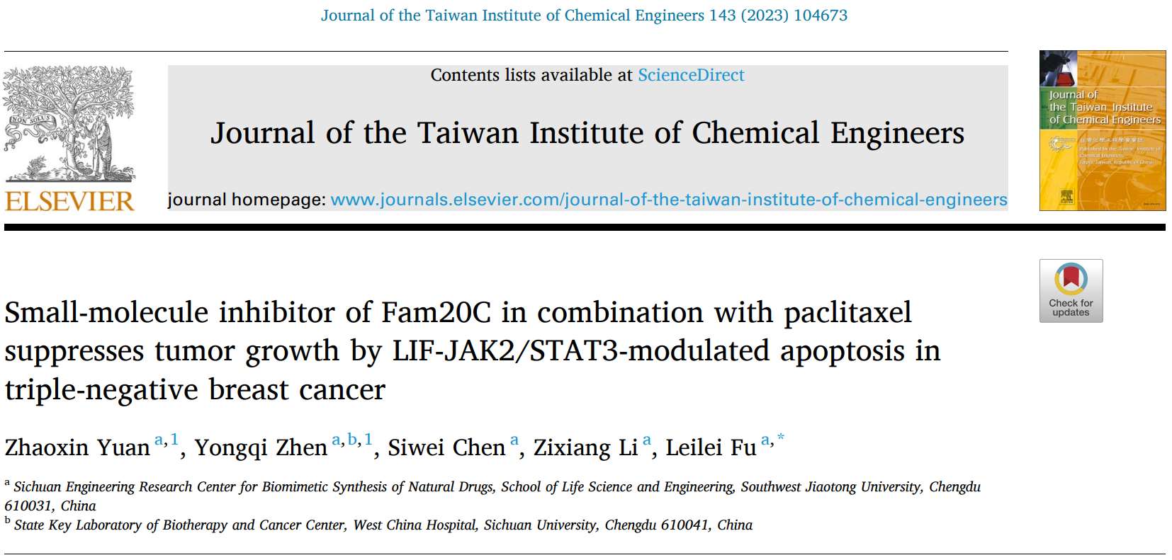 近日,符雷蕾研究小组在Journal of the Taiwan Institute of Chemical Engineers期刊上发表了题为Small-molecule inhibitor of Fam20C in combination with paclitaxel suppresses tumor growth by LIF-JAK2/STAT3-modulated apoptosis in triple-negative breast cancer的研究性文章(Volume 143, February 2023, 104673. 影响因子5.47)。91视频