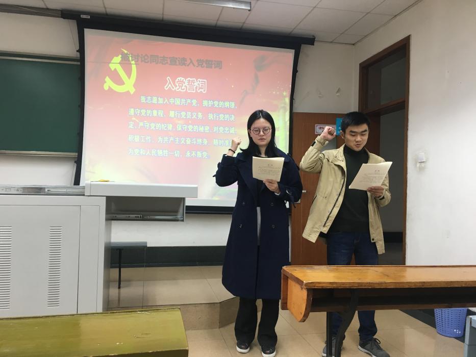 首先,就唐豫媛、周正东两位同志的发展入党和余婷婷、张雪梅、袁娟娟、黄子恩、卢彦姣等五位预备党员转正的问题进行研究讨论。由唐豫媛等七位同志汇报自己的思想、学习、工作等情况;由培养考察人和党支部书记等介绍七位同志在入党积极分子考察期(预备期)的考察情况;请全体党员根据唐豫媛等七位同志的入党动机及个人表现发表意见。最后,全体正式党员以无记名投票的方式,一致同意唐豫媛等两位同志成为预备党员、余婷婷等五位预备党员按期转正。随后,支部书记徐瑶带领大家宣读了入党誓词。