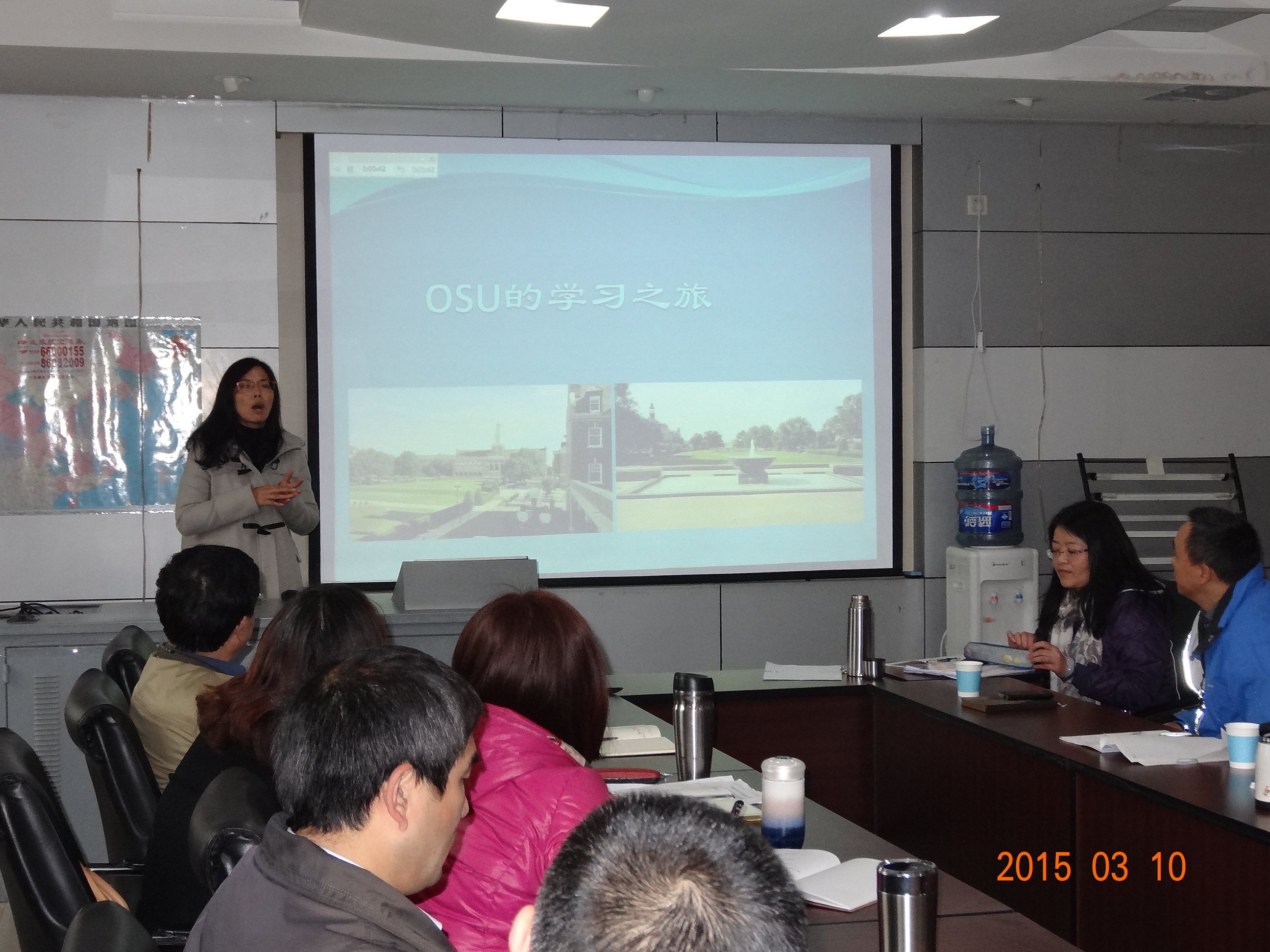 2014年学院出国学习归国的闫智勇、万军、王万军、廖海、郭泰林、刘新荣6位老师分别就自己在国外的专业课程学习、英语能力学习、科研学习等方面的收获与心得依次做了专题汇报,6位老师会前都做了精心准备,会上使用PPT图文并茂的交流了自己的研修或访学情况、收获与体会。并表示出国学习开阔了视野、启迪了思维,在教学和科研中也收获了一些经验,这些经验将结合工作实际运用到今后的教学科研工作中。