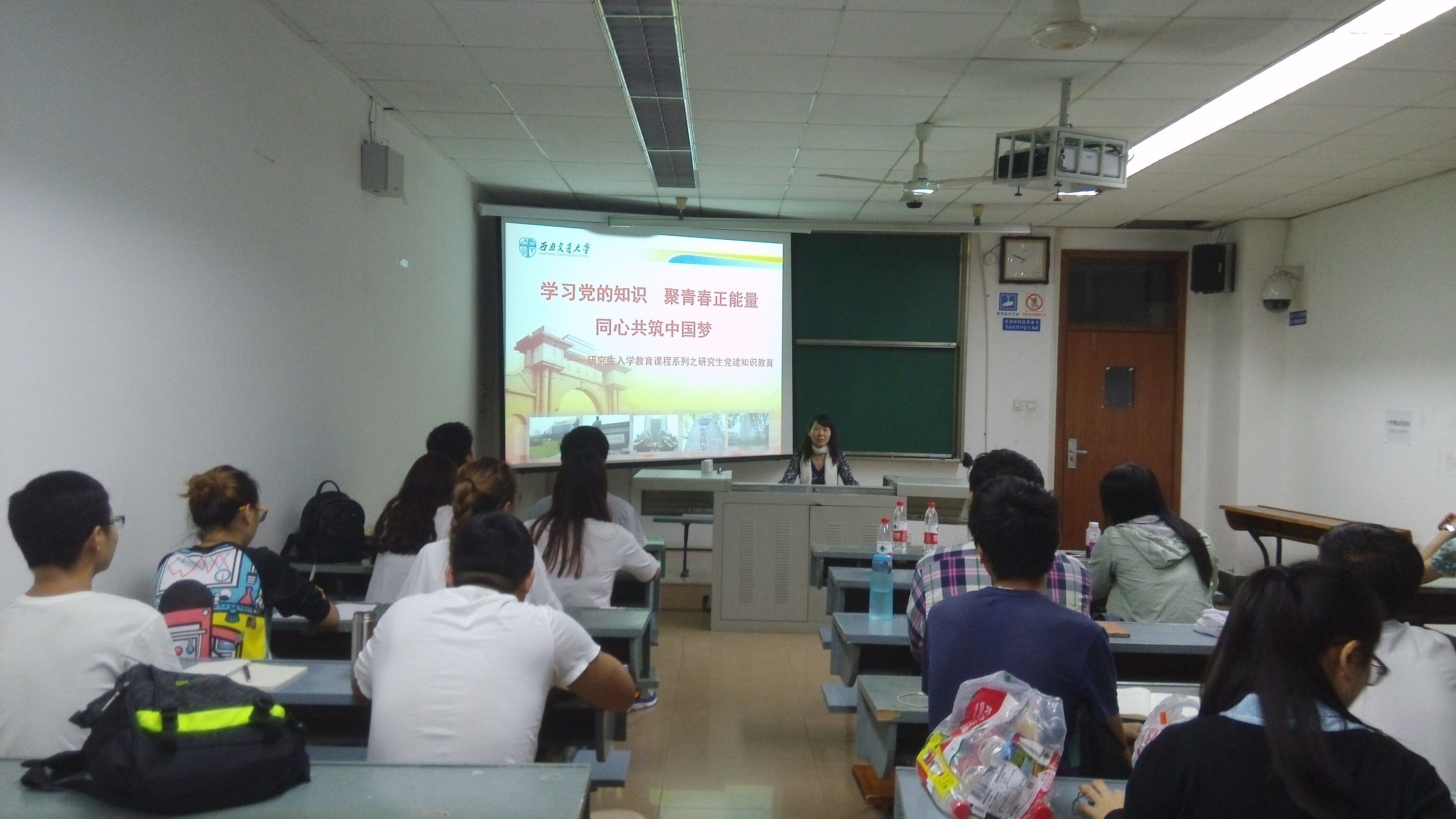 2016级研究生新生入学教育之研究生党建专题教育于9月21日晚在4305A顺利开展。本次活动由研究生16级1班党支部书记曹楠普主持,党支部指导老师、学院党委委员贺妍老师进行主讲,全体研究生新生党员和入党积极分子参加了活动。