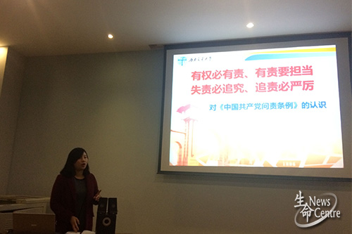 本次会议分为两部分,首先由高鹏从“条例背景”、“四大看点”、“条例解读”以及“以案释例”四个方面带领全体同志学习《中国共产党问责条例》。她强调,有权必有责、有责要担当、失责必追究、追责必严厉,并告诫同志们作为学生干部,要严于律己、以身作则。同时,高鹏同志通过举例与对比,生动形象地阐释了《中国共产党问责条例》与《中国共产党廉洁自律准则》、《中国共产党纪律处分条例》之间的区别和联系,加深同志们对于《条例》与《准则》的理解。