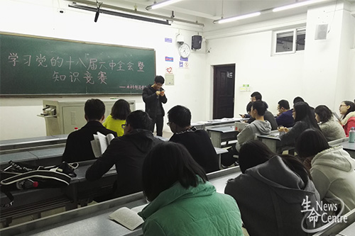 本科制药党支部在X1229召开学习党的十八届六中全会精神暨知识竞赛活动。到场的有学院团委副书记孔琳,党支部全体党员及预备党员。