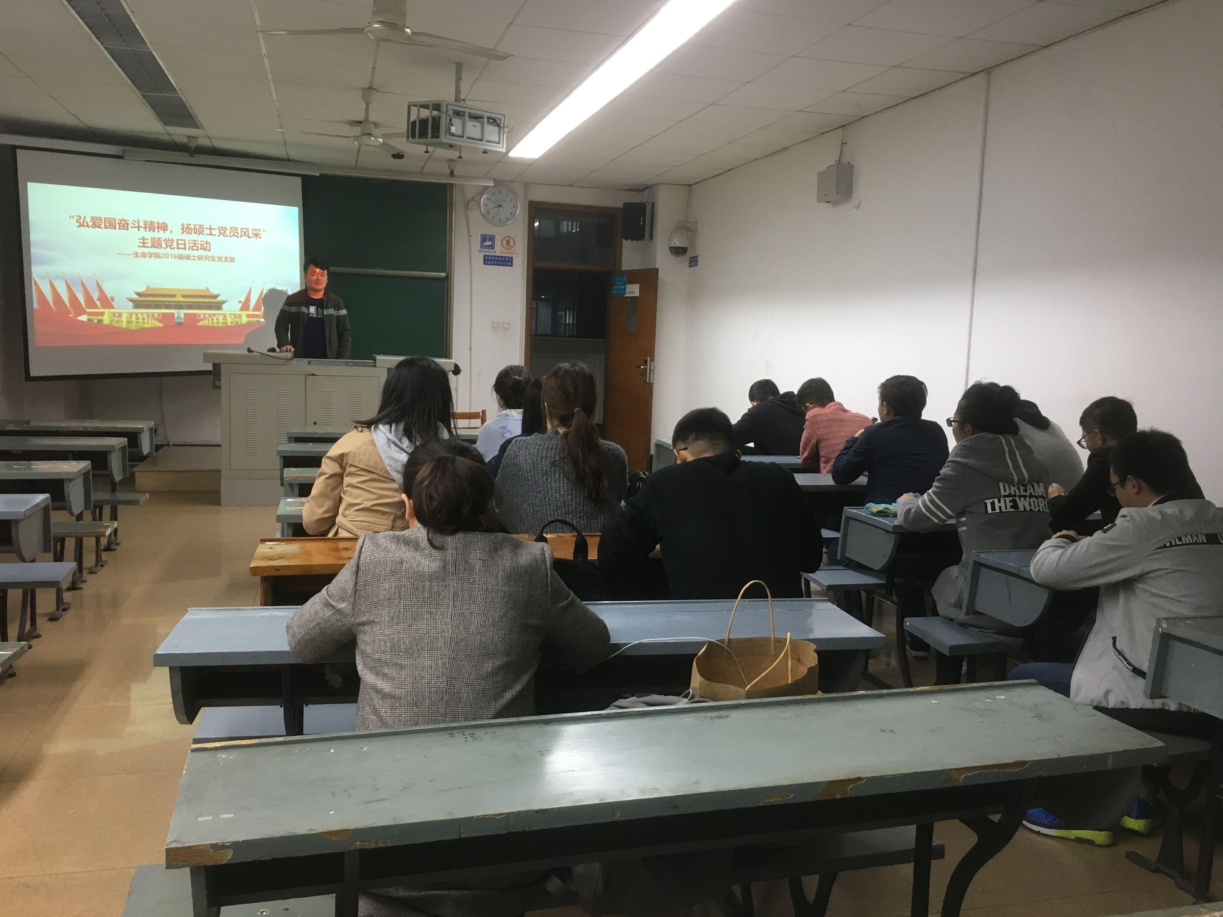 2016级硕士党支部于10月18日晚在4305A教室召开“弘爱国奋斗精神,扬硕士党员风采”主题党日活动。活动由支部书记韦乐华主持,支部全体党员参加了学习,支部指导教师、学院专职组织员华晶晶也出席了本次活动。