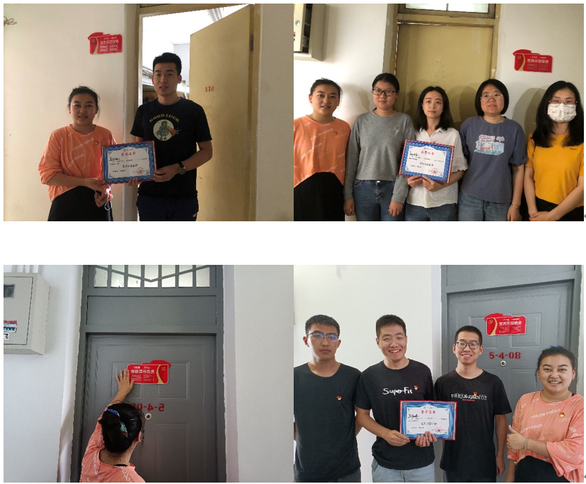 兰卓老师和胡慧怡老师首先为获得“党员示范宿舍”称号的J125030、J123053、J54008、T154060四间宿舍依次颁发了荣誉证书,并为“党员示范宿舍”挂牌,同时,为保障同学们在宿舍的学习和生活安全,兰卓老师、胡慧怡老师及院研究生会深入学生宿舍,依据《91视频