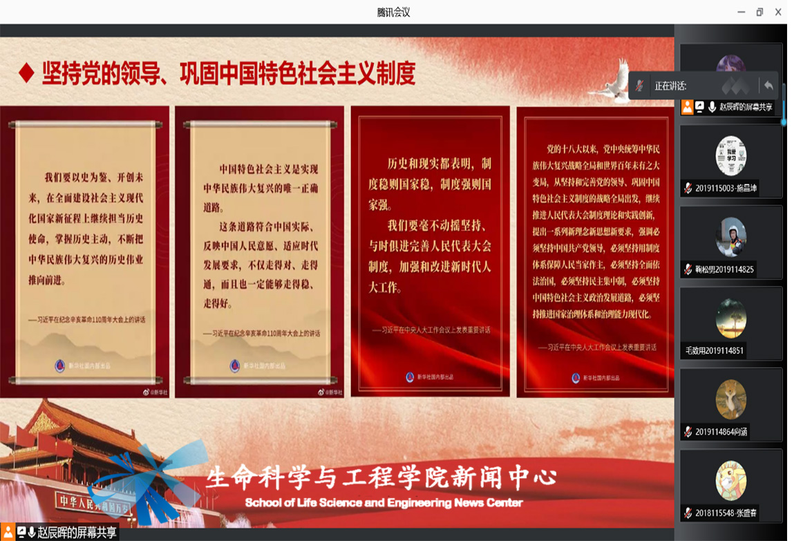 本科生物工程党支部于2021年10月25日下午8时,组织支部成员开展了主题为“中国共产党百年与政治制度建设”的线上学习会议。本次会议由赵辰晖同志主持。