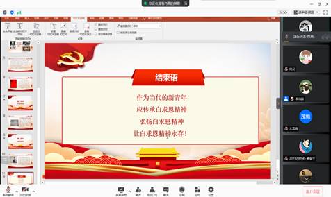 接着,肖燕同志讲述了新冠疫情爆发以来,医护人员身上也展现了白求恩精神,面对来势汹汹的疫情,医护人员叮嘱我们安心待在家中,他们却身赴一线,用实际行动践行“国有难,召必回,战必胜”的铿锵誓言。作为新时代的青年,我们更要勇担使命,传承白求恩先生的精神,为祖国的建设贡献自己的力量。