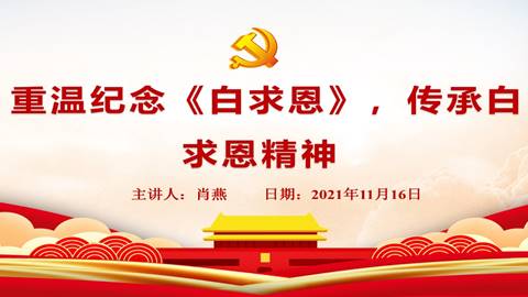 活动伊始,肖燕同志首先带领大家观看了一段白求恩先生在中国参加抗日革命的影片。“不畏艰苦、甘于奉献、救死扶伤、大爱无疆”,这是白求恩先生的精神写照。1937年,中国抗日战争爆发,1938年,他带着由加拿大人和美国人组成的医疗队伍来到中国延安,在工作的一年半时间里他为中国抗日革命呕心沥血,然而不幸的是,1939年11月12日因败血症医治无效去世。