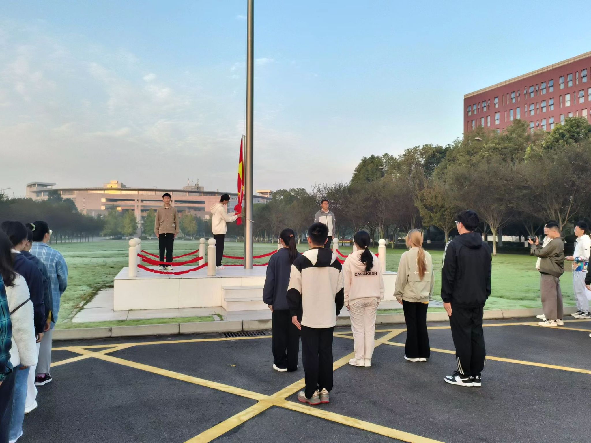 随着东方第一缕阳光穿透云层,由2024级本科生团支部9名学生代表组成的国旗护卫队踏着铿锵有力的步伐,护送鲜艳的五星红旗走向旗杆。在这庄严的时刻,全体师生肃立行注目礼,唱国歌,完成了此次升国旗活动。