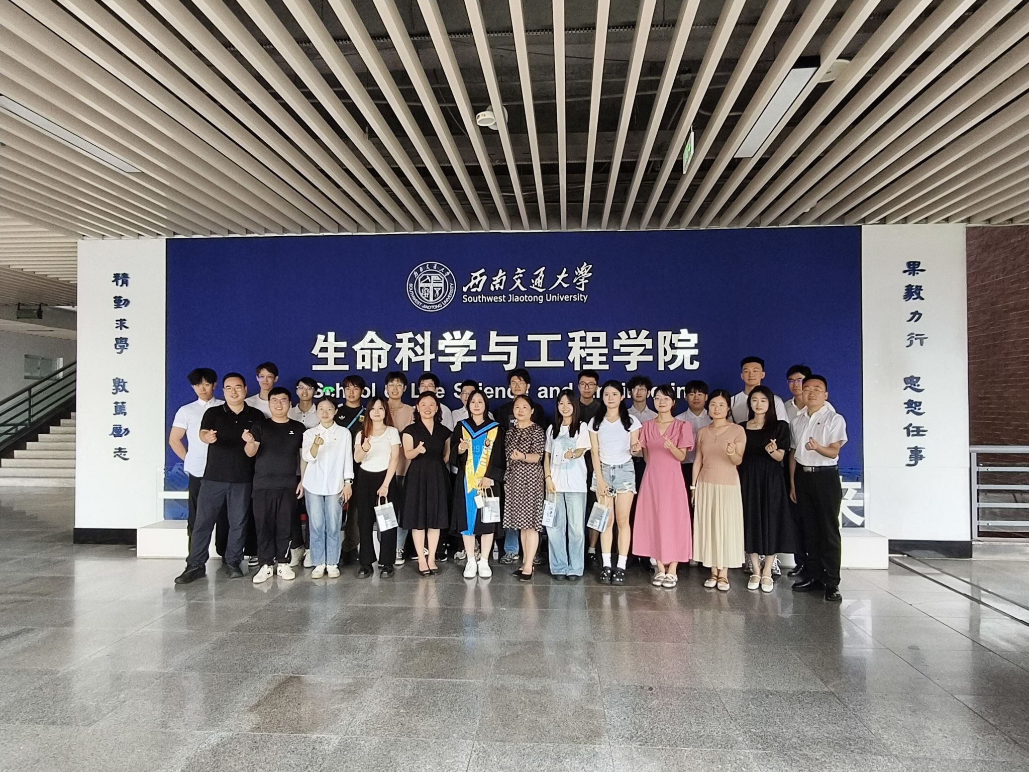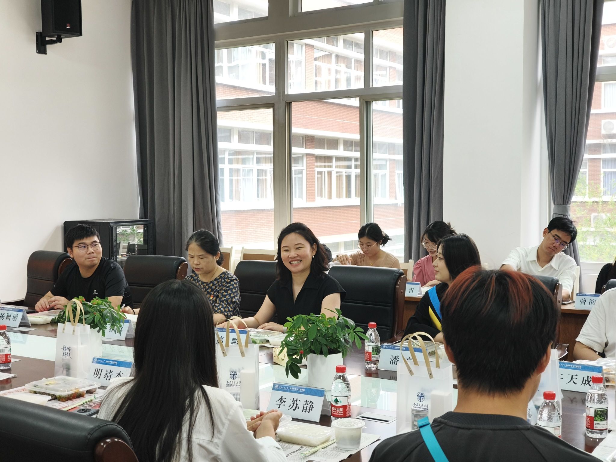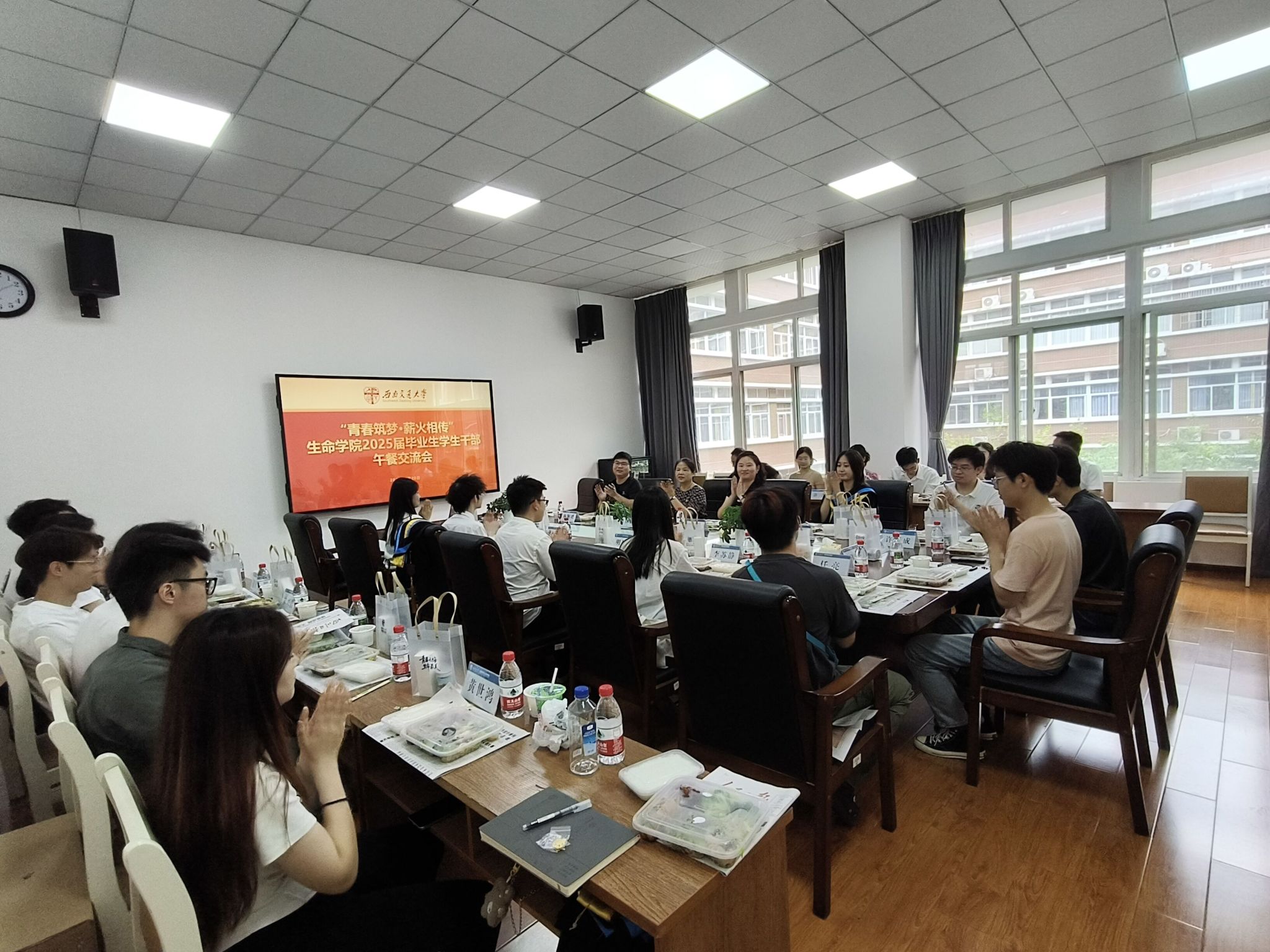 在轻松愉悦的午餐氛围中,师生围坐畅谈,餐盘里盛满的不仅是美味午餐,更是学院对2025届毕业生们的殷切祝福。毕业生学生干部们敞开心扉,将这场聚会变成了一场别开生面的"青春梦想分享会"。大家纷纷分享了自己的职业规划和人生理想,团建中心徐同学结合自身在苏州医疗产业的实习经历,向同学们发出邀请:"苏州生物医药产业园已形成完整产业链,期待与更多校友在长三角地区共同发展。"即将赴四川大学深造的杨同学则表达了对科研的热忱:"合成生物学领域充满无限可能,希望能与志同道合的伙伴一起探索生命科学的奥秘。"青年志愿者协会陈同学从行业视角分享了对生物医药领域发展的见解;学生事务中心方同学结合就业经历,鼓励同学们:"生物医药是国家重点发展领域,坚持专业深耕必将收获成长。"学生融媒体中心李同学、学生会董同学等学生骨干也分享了各自的毕业去向,并相约未来在各自城市再聚首。