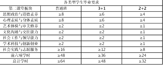 “第二课堂成绩单制度”实施办法》规定,本科生按要求完成规定的64个学时者(思想政治与道德素养、心理素质与身体素质两个模块至少选修8个学时,学术科技与创新创业、文化沟通与交往能力、艺术体验与审美修养、社会工作与领导能力四个模块至少选修2个学时,社会实践与志愿服务模块至少选修16个学时),才能予以毕业。