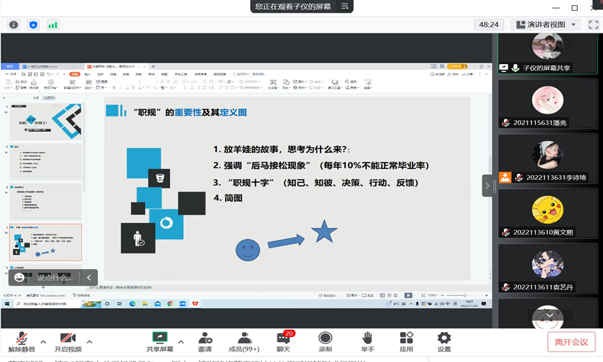21:00,活动顺利结束。此次讲座不仅唤醒了2022级新同学的生涯意识,也帮助他们明确了本科期间学习生涯的方向。
