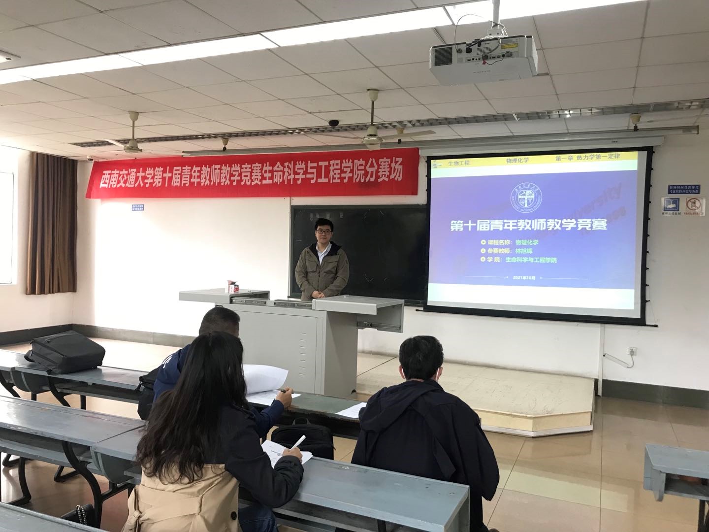 在规定的20分钟时间里,青年教师在讲台上展现了各自风采,精彩纷呈,参赛教师从教学内容、教学思路、板书设计、思政等环节,多方位的给评审老师展示了各自扎实的教学功底。评审老师的提问、答疑等互动环节给青年教师提供了宝贵的教学经验,现场氛围活跃。