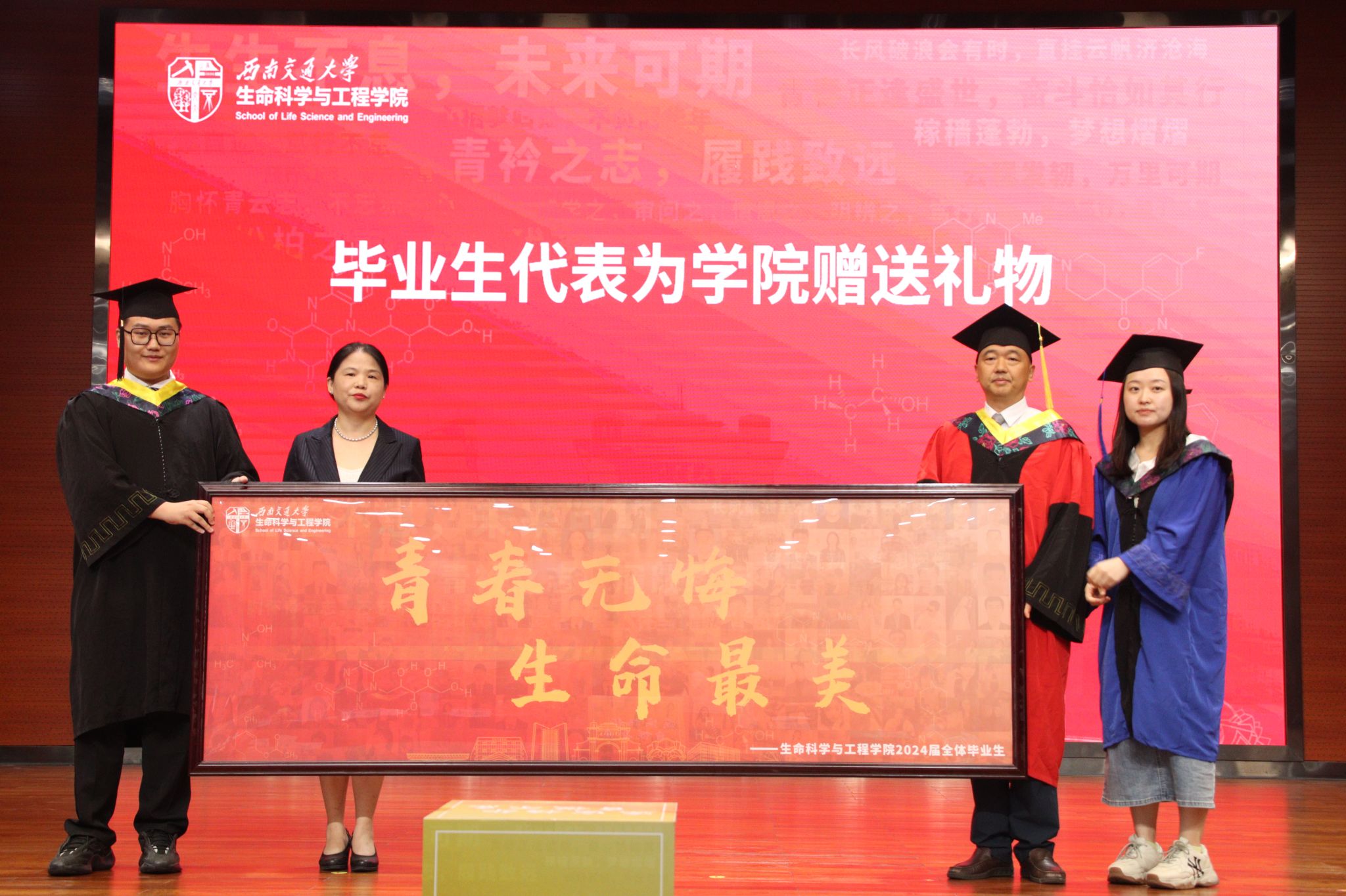 为2024年毕业生也精心准备了一份“时钟夜灯无线充电台”毕业礼物,学院毕业礼物由杜隆飞校友联系科伦药业赞助支持。这份礼物不仅代表着校友、企业对学弟学妹的关心,更寓意着对大家未来职业生涯的无限期望和祝福。杜隆飞校友、高峰副院长为毕业生代表发放毕业礼物,愿这份礼物陪伴毕业生们开启新的人生篇章。饮水思源,不忘初心。学院2024届毕业生也为学院精心准备了一份由全体毕业生照片组成的“青春无悔,生命最美”礼物,以表达他们对学院的感激之情和美好祝愿。周先礼院长、黄春蓉书记代表学院接受毕业生向学院赠送的礼物。