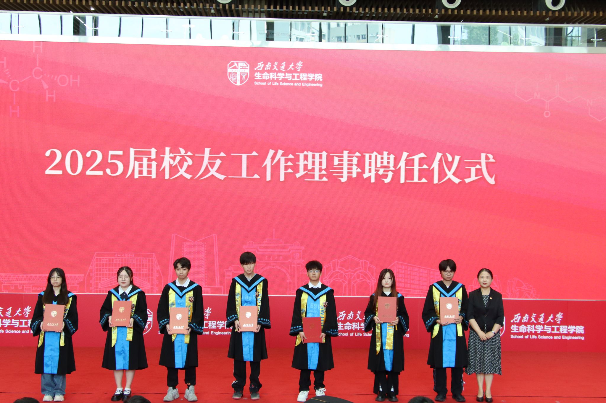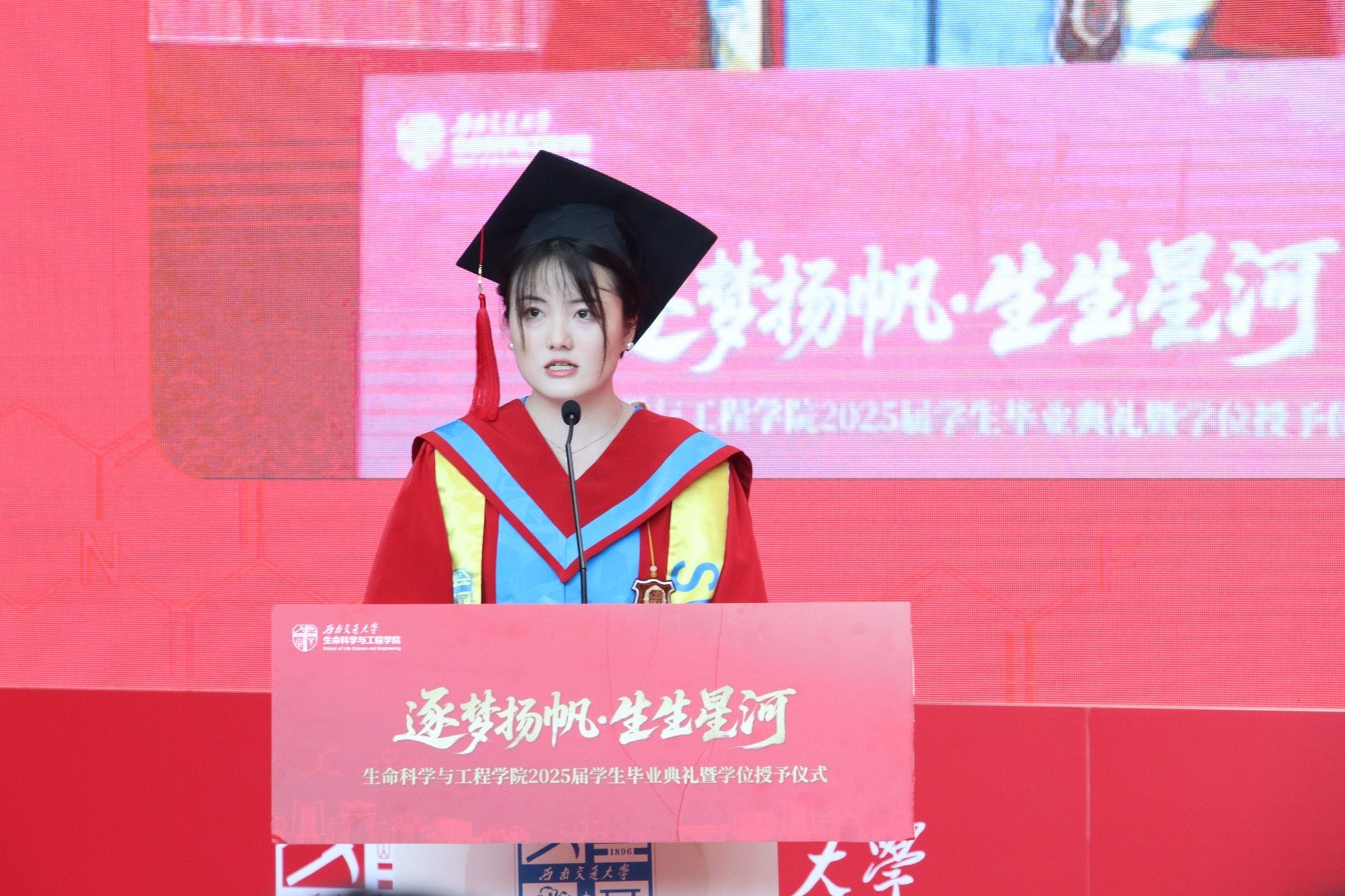 典礼现场洋溢着浓浓的师生情谊。在学院办学25周年之际,学院首届毕业生校友们在祖国各地,通过视频送来祝福。2000级生物工程专业校友代表、成都温江科创中学副校长蔡辉儒在典礼现场分享了自己在生物医药领域的奋斗故事,勉励学弟学妹永葆学习热情,同时珍惜家庭温暖。2025届毕业生则献上精心准备的礼物——由全体毕业生共同拼贴的“25”数字艺术画,庆祝学院办学25周年。