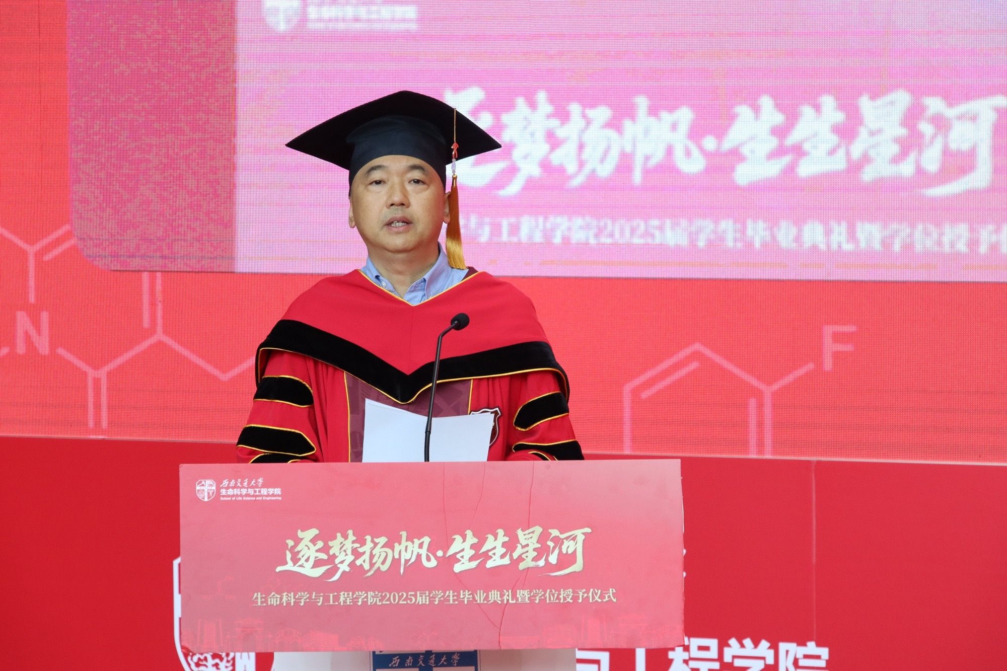 典礼在庄严的国歌声中拉开帷幕。周先礼院长首先致辞,向圆满完成学业的268名本科生、147名硕士研究生和9名博士研究生表示热烈祝贺。周院长深情回顾了同学们在校期间的成长历程,特别指出本届毕业生恰逢学院办学25周年的重要历史节点,面对生命健康产业发展的黄金机遇期,周院长对毕业生提出三点殷切期望:一要心怀“国之大者”,以家国情怀引领人生方向;二要坚守“德之厚者”,以高尚品格筑牢立身之本;三要秉持“行之实者”,以实干精神托举人生梦想。最后,他祝愿全体毕业生前程似锦,并深情表示母校永远是学子们的精神家园。