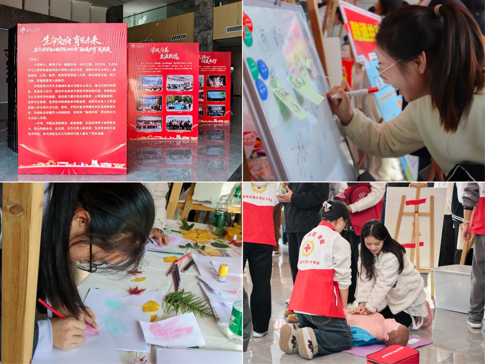 大会开始前,现场同步举办“融通共育”成果展及主题游园活动。成果展以图文形式系统展示了学院在党建思政、学风生涯、体育健康、美育心理、劳动实践等方面的融合育人成效。主题游园活动结合学科特色,设置急救实训、植物拓印等八个互动体验项目,吸引师生广泛参与,以寓教于乐的方式生动贯穿“融通共育”育人理念,现场气氛热烈。