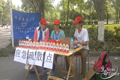 青年志愿者协会在11号楼与15号楼下设置了地震应急服务点,为需要救援的同学提供矿泉水,救援传单。学生会则利用人人、微博、微信等各种网络平台发布最新地震消息,使更多的同学了解到最新消息。
