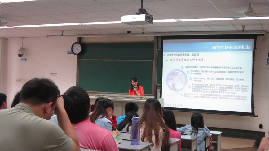 马超英教授细致地向同学们讲述什么是“科学精神”,何为“学术道德”,用生动鲜活的例子向同学讲述科学精神的重要性,并向同学们强调在今后的科研之路中要严守学术道德,唯有真实的成果才是自己的成果。 贺妍老师向同学们介绍了我校研究生教育管理工作开展的情况,强调了关于研究生的学业管理和安全教育问题,并细心地讲解了同学们较为关心的学院以及学校对于研究生的奖助政策,包括了奖学金如何评定、助学贷款及助学金的申请等问题。