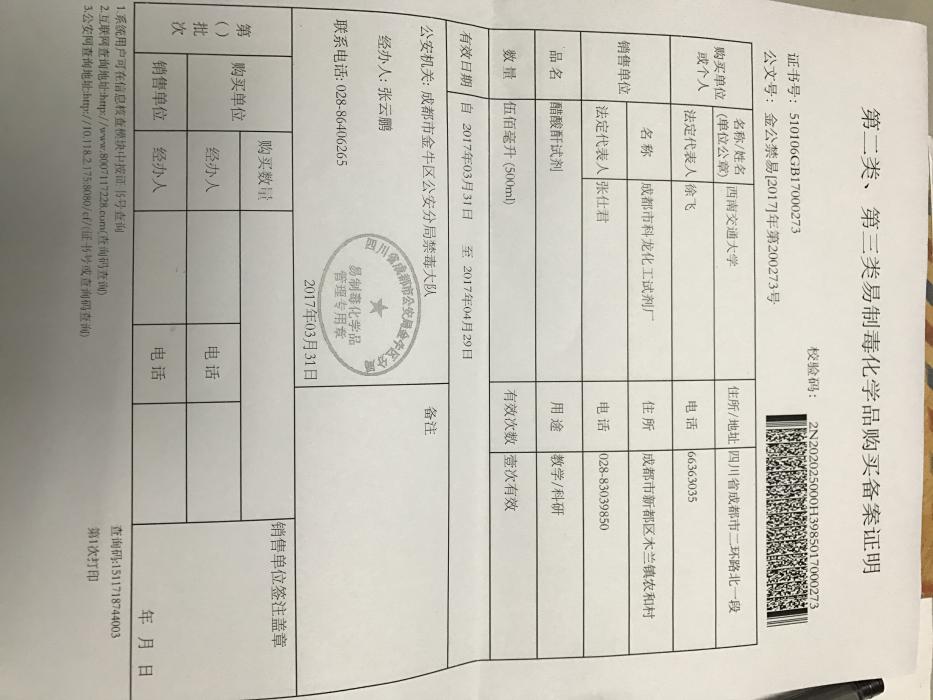 根据各位老师上个月提交的购置申请,目前已经依次完成资实处审核、保卫处审核、学校备案、与销售单位签订合同等环节,由资实处通过四川省易制毒化学品管理系统向公安部门申请到了所需的配额(备案证明见附件),备案证明的有效期为一个月(3.31-4.29),所有老师的购买必须在此规定时间内一次性完成。