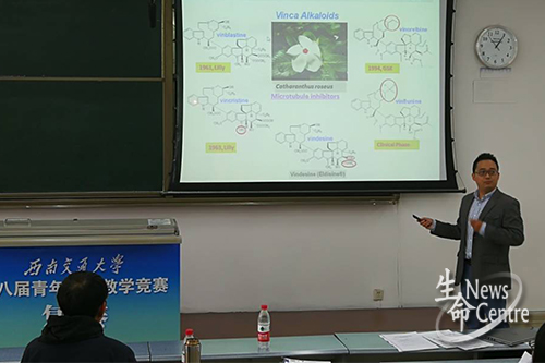 五位青年教师按要求编写教案、积极准备,通过模拟真实课堂,有层次、有重点地对专业知识进行讲授。高峰老师由屠呦呦从黄花蒿中提取青蒿素获得诺贝尔医学奖引入天然药物化学主题,重点介绍了抗肿瘤药物长春碱、紫杉醇以及喜树碱的发现及发展历程,并以最新的天然抗癌药物埃博霉素为例,提出了天然药物结合药物化学和药理学的研究仍是新药的重要来源。
