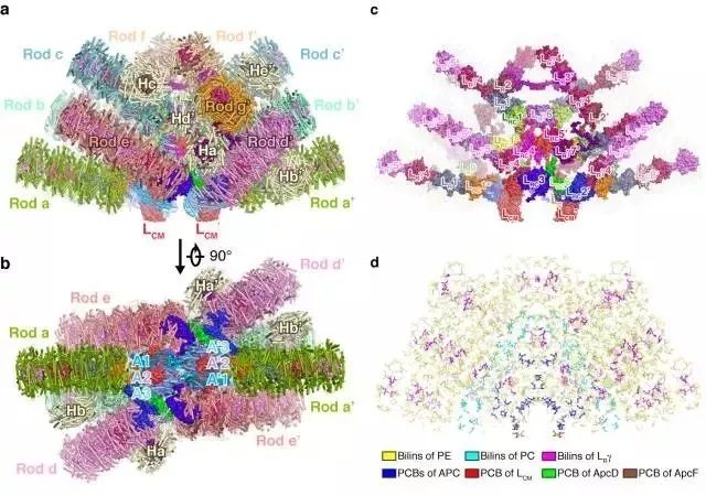 图示为红藻藻胆体的三维结构,ab分别为正面和底面两个不同取向,c为由连接蛋白形成的结构骨架,d为色素的整体分布