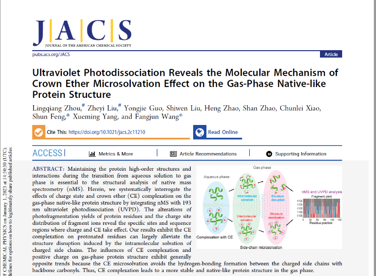 “生命分析技术与材料”封顺教授团队与中国科学院大连化学物理研究所王方军教授和杨学明院士团队合作的最新研究成果“Ultraviolet Photodissociation Reveals the Molecular Mechanism of Crown Ether Microsolvation Effect on the Gas-Phase Native-like Protein Structure” (DOI: 10.1021/jacs.2c11210)。论文共同一作为我校2020级硕士研究生周伶强和中科院大连化学物理研究所刘哲益副研究员,通讯作者为封顺教授和王方军研究员,91视频
