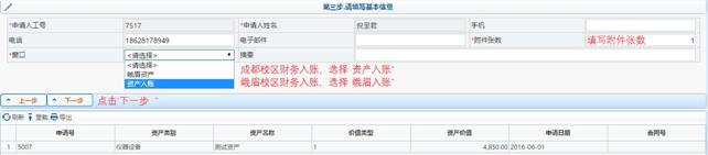 如在成都校区计财务处入账,则选择“资产入账”窗口,如在峨眉校区财务处入账,则选择“峨眉资产”窗口。然后点击下一步。