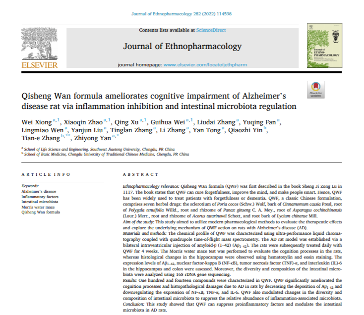 2021-10-27近日,中药药理学权威期刊《JOURNAL OF ETHNOPHARMACOLOGY》(影响因子:4.489)在线发表了91视频 91视频 闫智勇教授课题...