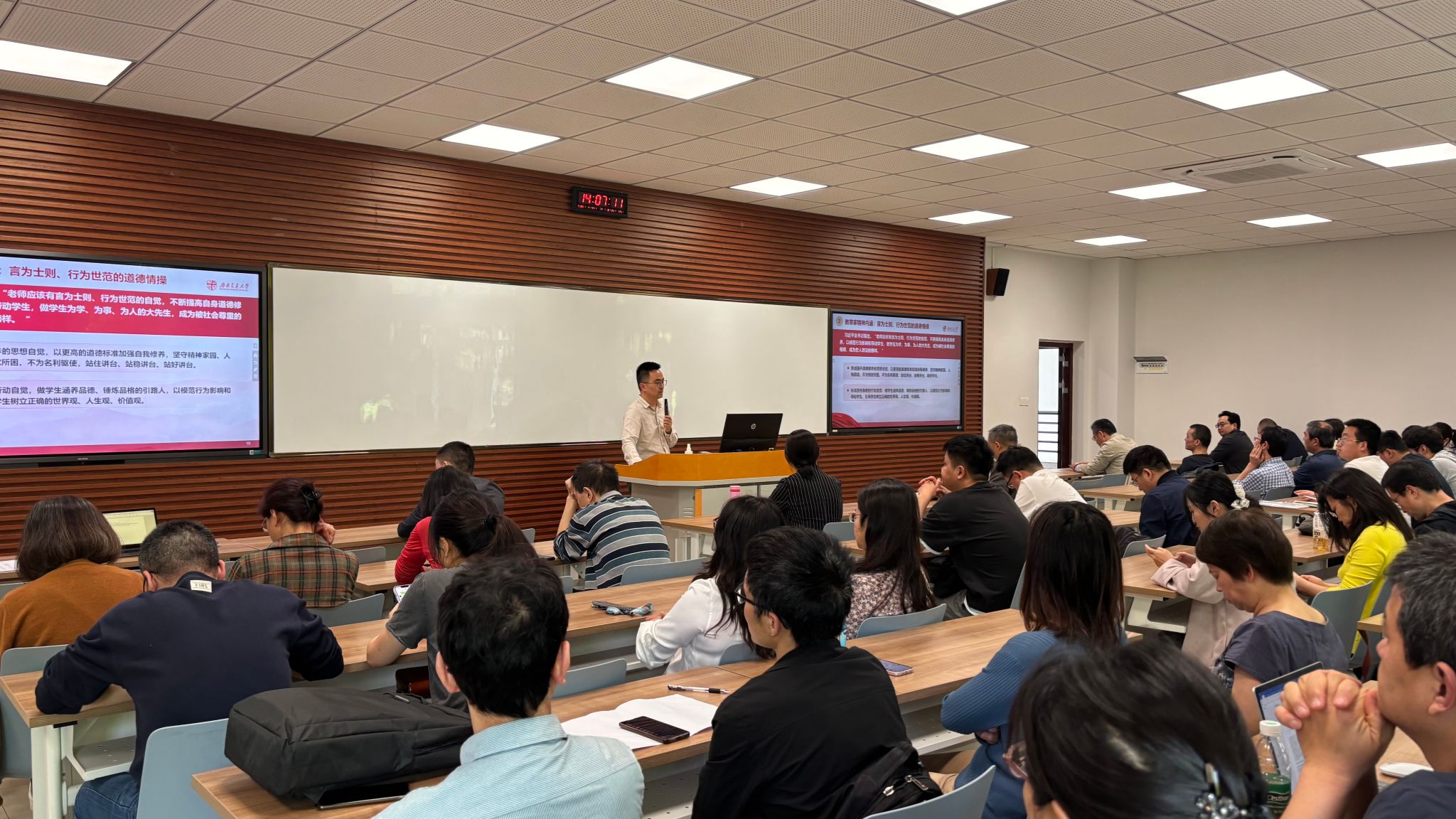 2025-04-264月24日下午,91视频 在犀浦校区X1201召开全体教职工大会暨师德师风教育宣讲会。会议由党委书记黄春蓉主持,学院全体教职工参加了会议。...