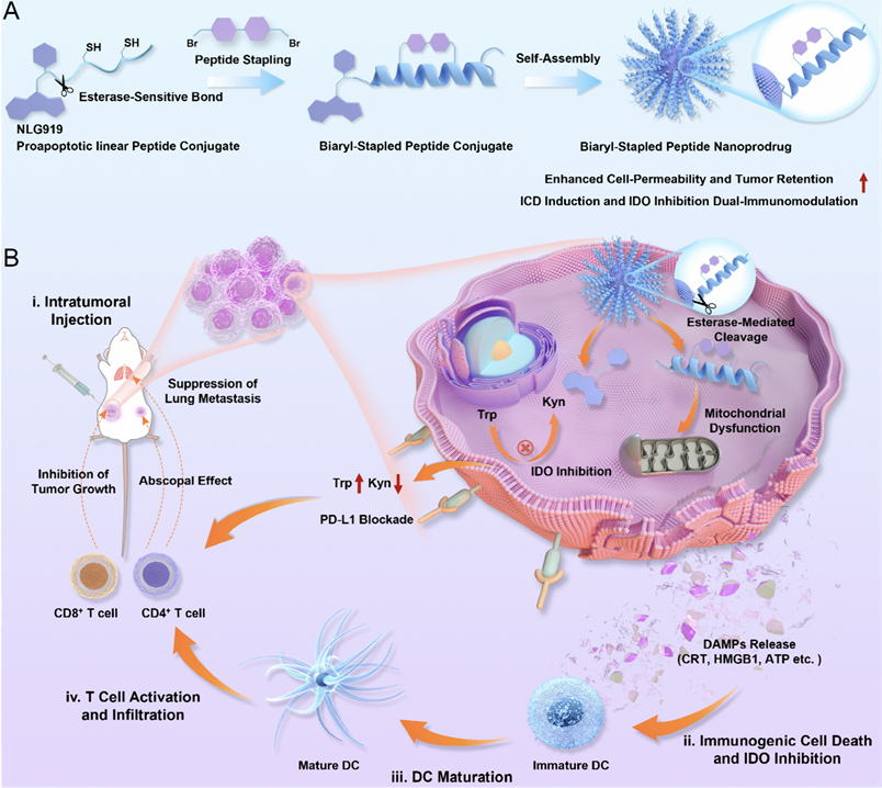 传统癌症免疫单一疗法的应答率往往有限,因此开发具有更强抗肿瘤效果的新型治疗策略具有重要意义。本研究设计了一种具有双重免疫调节能力的订书肽纳米前药用于增强免疫代谢相关癌症治疗。该纳米前药平台以联芳烃订书肽为骨架,通过酯键共价偶联吲哚胺2,3-双加氧酶(IDO)抑制剂NLG919,通过亲疏水作用自组装形成纳米前药。该前药可在肿瘤微环境中被酯酶特异性触发,激活后的订书肽可高效诱导免疫原性细胞死亡(ICD),而NLG919则选择性抑制IDO活性,从而逆转犬尿氨酸途径介导的免疫抑制。联芳烃环状侧链结构稳定多肽螺旋构象,结合纳米自组装,显著提高了抗酶解和细胞穿透能力,有效克服了肿瘤组织屏障,并实现了在肿瘤部位的长效局部药物释放。体内实验结果显示,该双重免疫调节策略联合PD-L1阻断可显著提升抗肿瘤免疫疗效。综上,本研究为基于订书肽的前药平台开发提供了新思路,拓展了其在癌症免疫治疗领域的应用潜力。