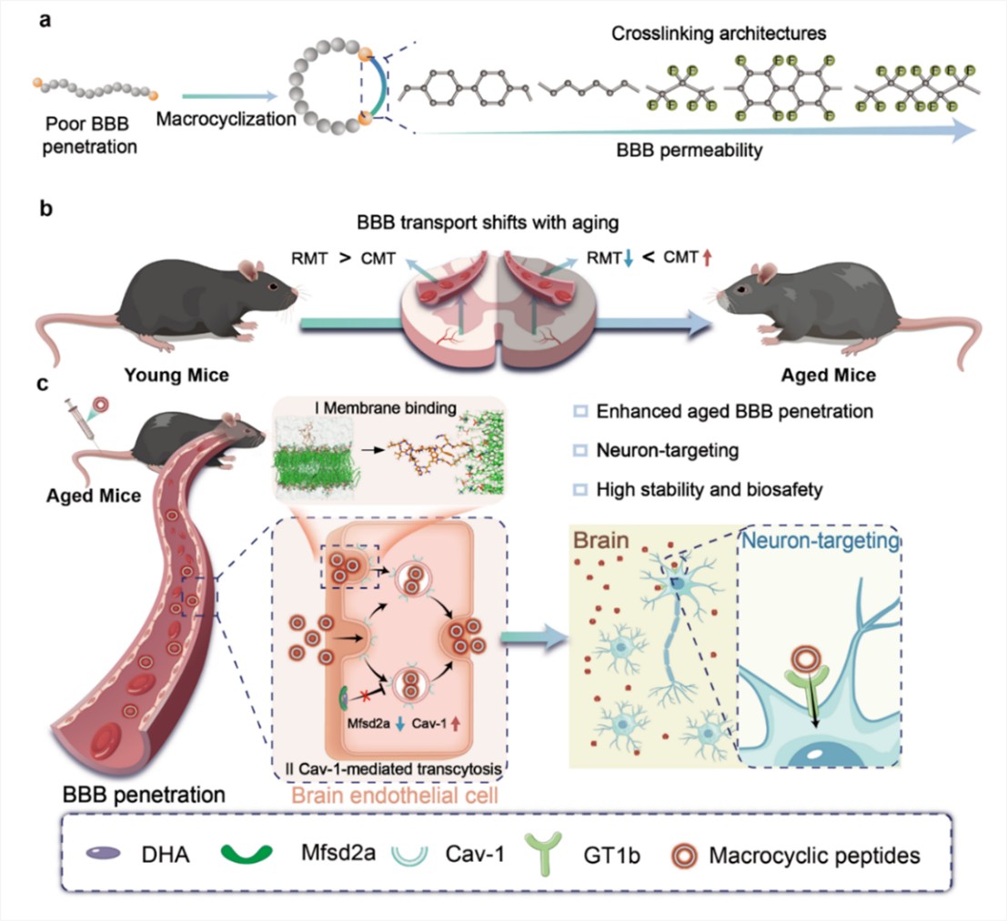 血脑屏障(BBB)是治疗药物进入中枢神经系统的重要生物屏障。受体介导的转胞运作用(RMT)是跨越BBB的高效策略之一,然而研究表明内皮细胞的关键转运受体随年龄增长显著下调,限制了其在年龄相关疾病中的作用,也进一步凸显开发可适应衰老特征的跨BBB新策略的迫切性。本研究报道了一种可高效穿透BBB并靶向神经元的环状穿梭多肽,通过化学工程优化环状交联结构,精准调控多肽亲脂性,实现了主动触发衰老脑内皮细胞中的特定转胞运作用以高效穿透BBB。在老年小鼠模型中,该环状穿梭多肽的跨BBB效率显著优于现有被广泛报道的受体介导型穿梭多肽,且具备良好的生物相容性,该工作为年龄相关中枢神经系统药物递送提供了新的工具分子,有助于进一步推动新型偶联药物的研发。